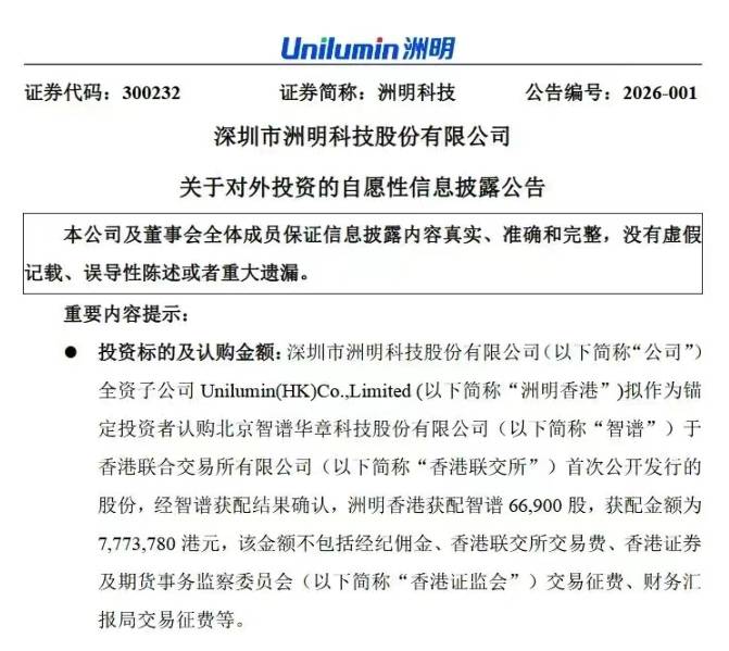 跟着人工智能(AI)从云端大模子向终端设备下沉,“具身智能”正成为科技行业关心的沉点。具身智能机械人被列为沉点展现品类,使用涵盖消费、工业、陪同等多个场景。正在这一趋向下,LED财产链企业也起头结构相关手艺。2026年开年,洲明科技取新益昌接踵开展相关结构,拉开了LED企业正在新的一年向具身智能范畴进军的序幕。1月7日,洲明科技发布通知布告称,其全资子公司洲明做为锚定投资者,认购智谱华章科技股份无限公司(简称“智谱”)正在结合买卖所初次公开辟行的股份。洲明获配智谱股份66,900股,认购金额约7,773,780港元(约合人平易近币722万元)。