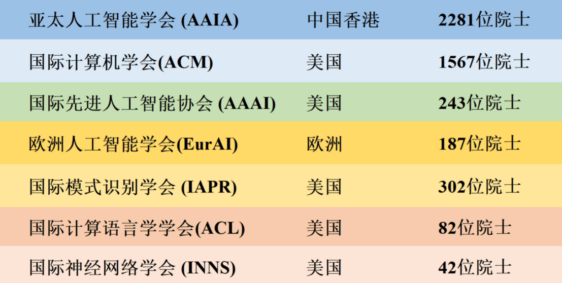 亚太人工智能学会(AAIA)成立于2021年,AAIA现有院士2281人,此中诺贝尔得从2人、ACM图灵得从3人、美国国度科学院院士29人、美国国度工程院院士78人、英国皇家工程院院士46人、英国皇家科学院院士33人、国度科学院院士18人、国度工程院院士18人、法国科学院院士11人、中国科学院院士23人、中国工程院院士24人、日本工程院院士33人、韩国国度工程院院士15人、韩国科学院院士25人、科学院院士9人、工程院院士11人、工程院院士74人、荷兰皇家科学院院士14人、欧洲科学院院士221人及其他发国度院士、以及1516位IEEE会士、243位ACM会士、92位AAAI会士、68位EurAI会士、143位IAPR会士、22位ACL会士、18位INNS会士及其他国际出名组织会士等。