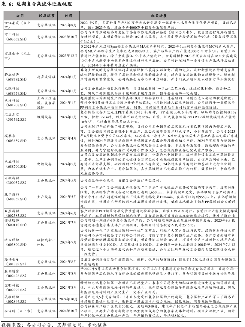 复合集流体参取企业逐渐添加,行业进展积极。2022年以来,复合集流体行业的参取者逐渐增加,财产化持续推进。目前复合铝箔根基具备量产前提,手艺线次要采用蒸发镀膜干法工艺,虽然正在制备成本、部门供应环节国产化方面还有较大优化空间,但批量使用前提曾经根基具备。复合集流体的规模化使用将会带来磁控溅射设备、水电镀设备和超声滚焊设备等新增设备需求,相关设备厂商无望受益。