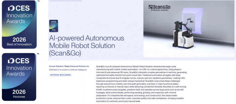 2026 年国际消费电子展(CES)的聚光灯聚焦拉斯维加斯会展核心,工业机械人 AI 范畴降生核心时辰 —— 源自和意精工的 AARS(自从自顺应机械人系统)手艺,联袂合做伙伴斗山机械人(Doosan Robotics),一举斩获 CES 2026 “人工智能” 类别 “最佳立异” ,成为本届 CES 独一正在双焦点赛道获的工业机械人智能化手艺!